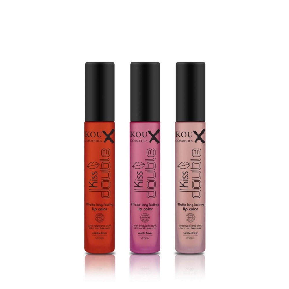 To Double Kiss matte lip color της Koux Cosmetics είναι ένα υγρό ανεξίτηλο κραγιόν μακράς διάρκειας με υαλουρονικό οξύ για αντιγήρανση και γέμισμα των χειλιών , με beeswax για φροντίδα και ενυδάτωση και velvet αποτέλεσμα. Με υπέροχο άρωμα βανίλιας .